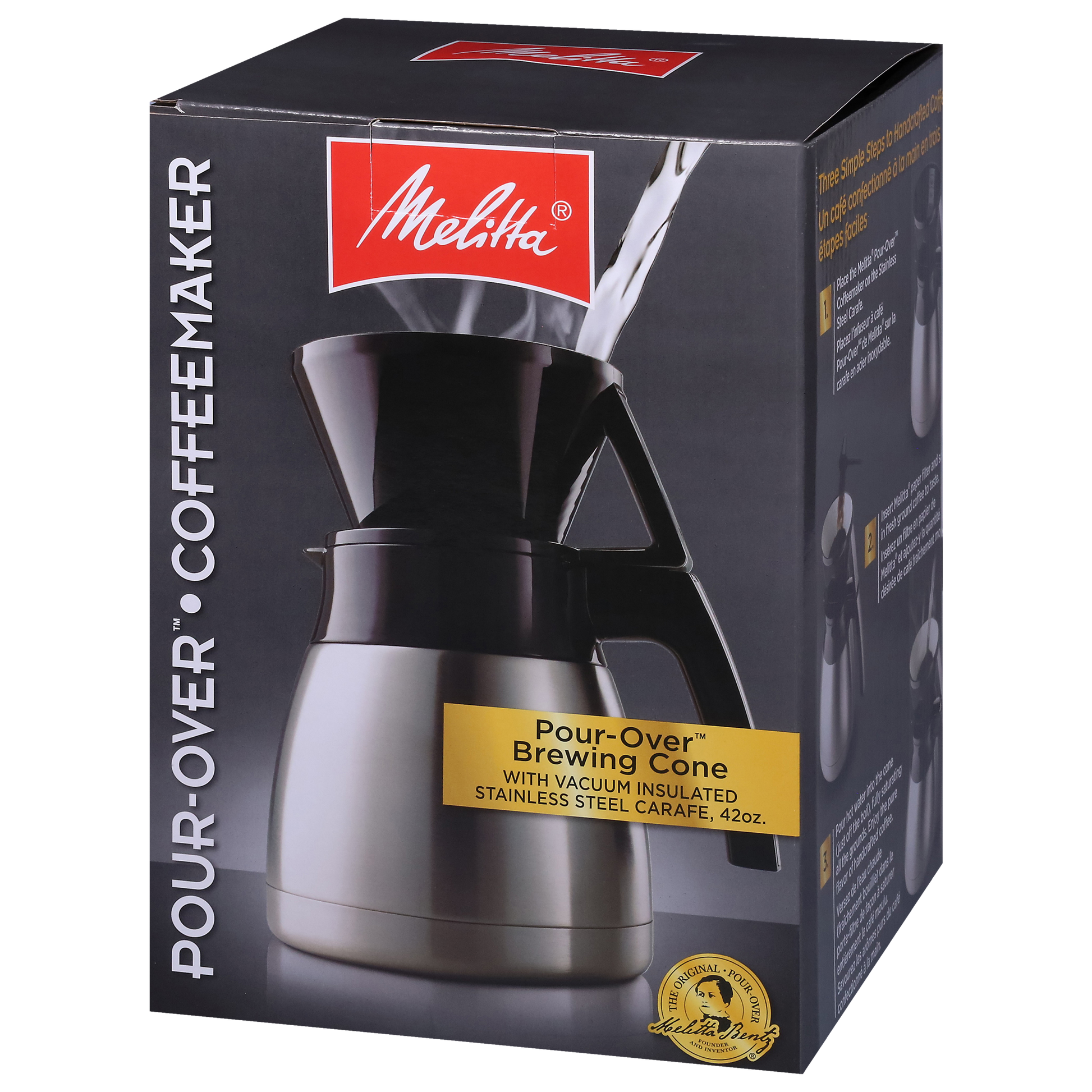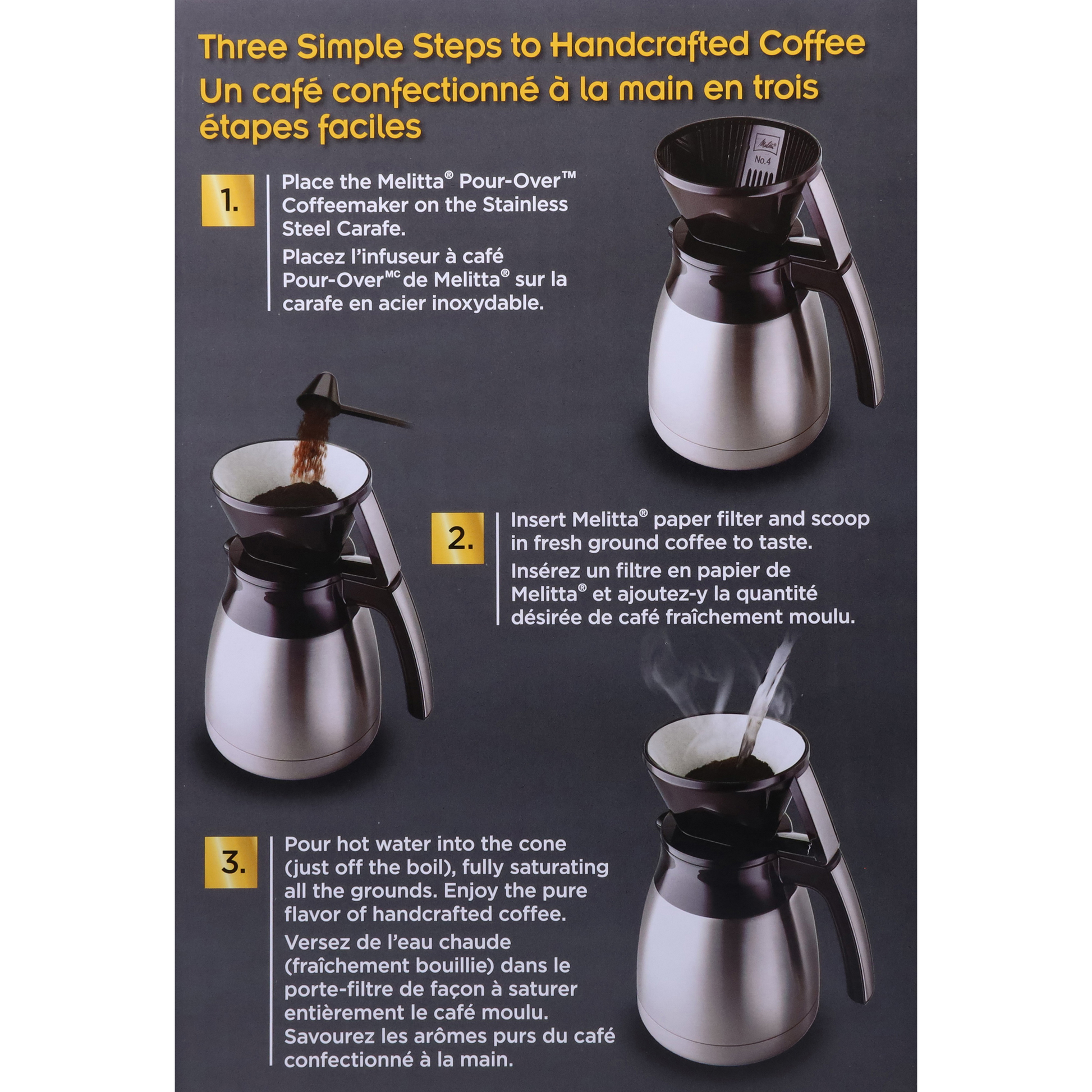- Fold the seams of the Melitta filter and place in Melitta cone pour-over brewer. Place pour-over on top of stainless steel carafe.